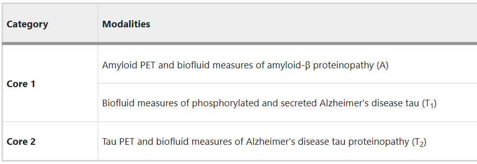 不特定于阿爾茨海默病,但在疾病發(fā)病機制中仍然起著重要的作用,如炎癥、免疫激活和神經(jīng)退行性變的生物標(biāo)志物。常見的非阿爾茨海默病伴隨病理的生物標(biāo)志物如腦血管疾病和α-突觸核蛋白病。其中,核心生物標(biāo)志物進(jìn)一步分為核心1類(A類和T1類)和核心2類(T2類)生物標(biāo)志物。核心1類生物標(biāo)志物用于阿爾茨海默病早期檢測,核心2類生物標(biāo)志物與核心1類結(jié)合使用時,可用于阿爾茨海默病嚴(yán)重程度的分期和預(yù)后評估。核心1類生物標(biāo)志物可用于阿爾茨海默病早期檢測,如果核心1類生物標(biāo)志物測試結(jié)果異常,就能夠診斷為阿爾茨海默病,包括:- 腦脊液中Aβ42與Aβ40的比值(Aβ42/40);